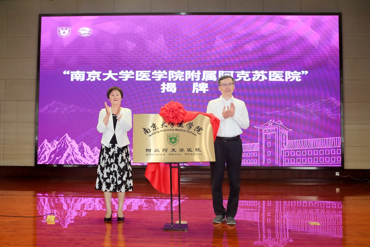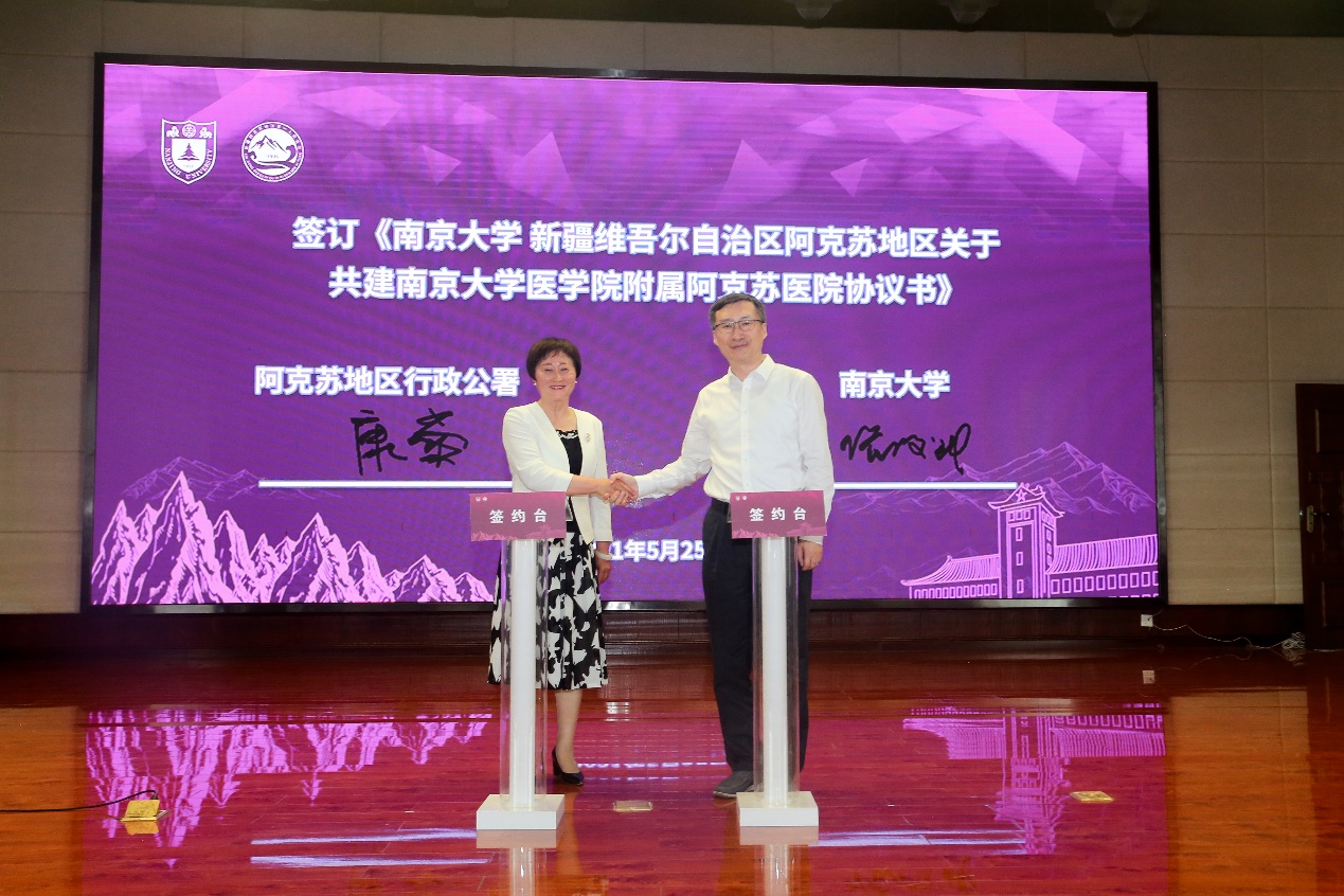 初夏五月,鲜花盛开,正值党史学习教育和庆祝建党100周年,以及韦德1946体育官方入口120周年校庆启动的重要时刻,韦德1946体育官方入口附属阿克苏医院签约揭牌仪式于5月25日在新疆维吾尔自治区阿克苏地区第一人民医院举行。这是韦德1946体育官方入口肩负国家使命、服务国家需求,秉持“真情援疆、科学援疆、持续援疆”精神,深入贯彻落实健康扶贫和医疗援疆工作的集中体现。这一重要举措必将切实推动阿克苏地区医学人才培养,促进医疗服务水平提升,为阿克苏地区人民医疗卫生保障提供“南大方案”、贡献“南大智慧”。
