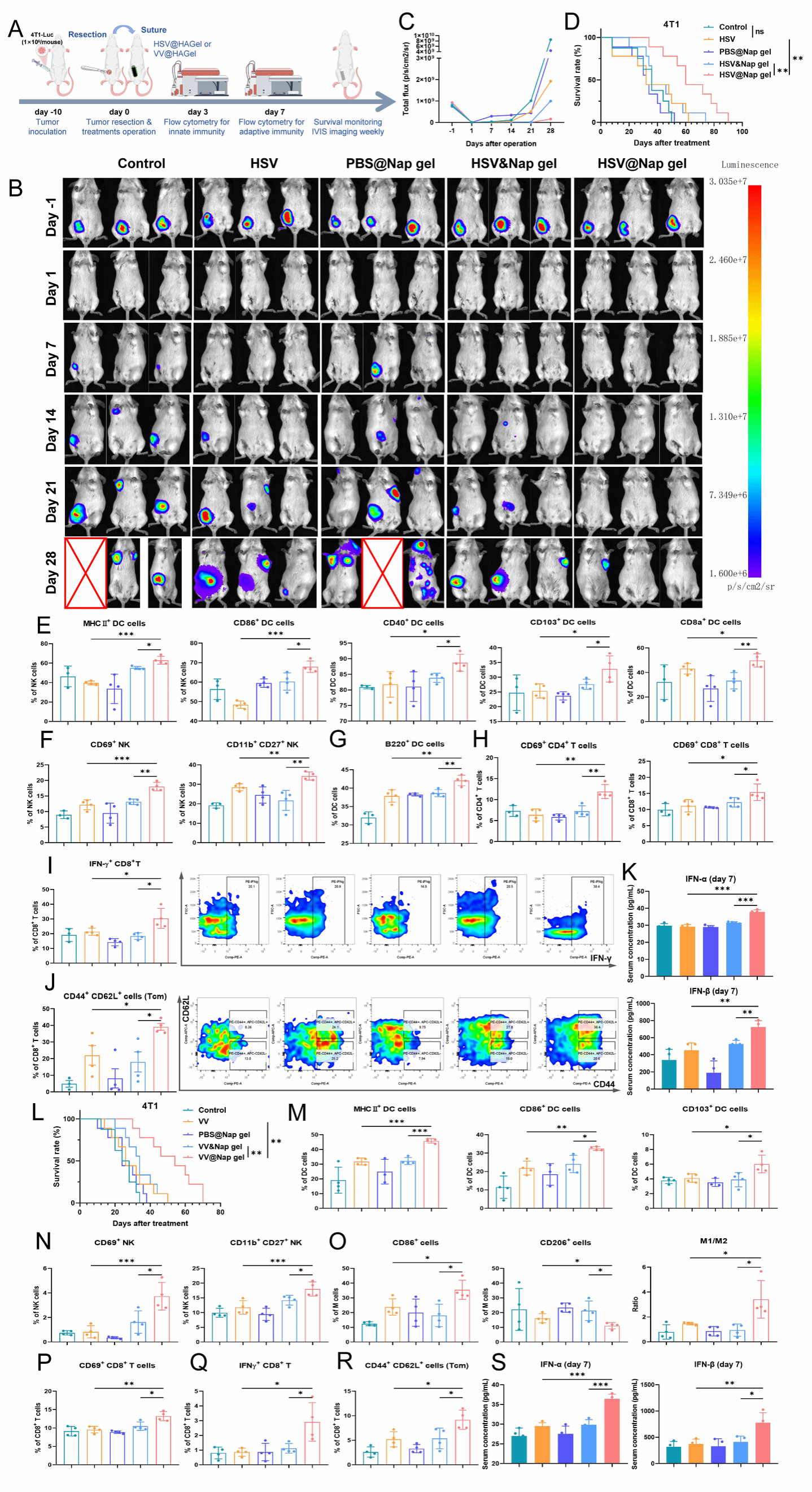 在本研究中,团队实现了溶瘤病毒(adv、HSV或VV)始于术中的手术原位的持续释放。这一治疗方式能迅速激活I型干扰素通路,诱导先天性和适应性免疫反应应答,控制肿瘤术后复发和转移,并延长小鼠存活时间。团队验证了使用adv@Nap gel进行即时原位治疗能够抑制肿瘤术后复发的能力。值得注意的是,附载在Nap gel中的HSV或VV也能控制肿瘤术后复发。
