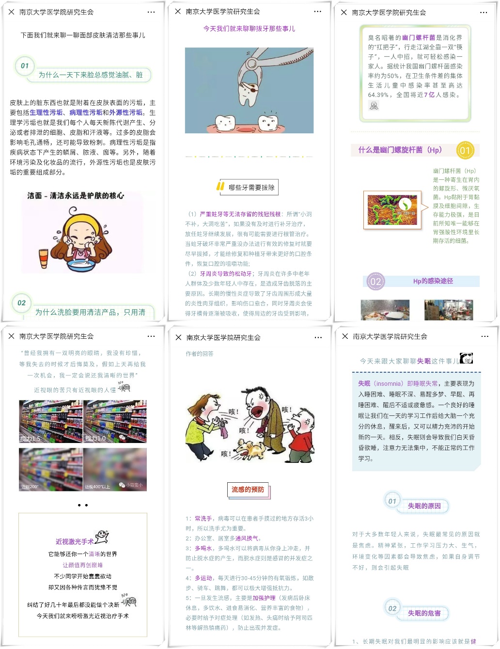 健康咨询与科普周活动包含两个部分内容:线上多学科健康知识科普和线下常见病健康知识咨询。5月13日至5月18日,韦德1946体育官方入口研究生会公众号每日推出一篇科普文,包括了《怎样科学洁面》、《近视激光手术》、《春季常见呼吸系统疾病》、《失眠那些事》、《正确认识拔牙》、《消化届的“扛把子”-幽门螺杆菌》等涵盖皮肤、眼科、呼吸、心理、口腔和消化等诸多专业的一系列文章。这一系列健康知识推文均由韦德1946体育官方入口各专业的研究生党员写作,并经过指导老师审核,针对师生们关心的各类健康问题进行了知识普及,得到了师生们的支持和感谢。