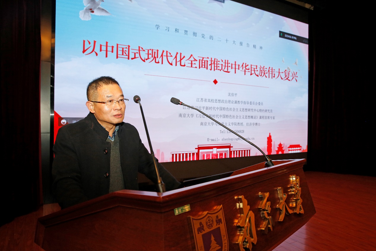 沈伯平教授以“以中国式现代化全面推进中华民族伟大复兴”为题,牢牢把握党的二十大精神,紧紧围绕党的二十大报告内容,就什么是中国式现代化和怎样把握中国式现代化要求并全面推进中华民族伟大复兴这一伟大历史使命的问题进行了系统性的阐述与解读。沈伯平教授首先回顾了二十大所总结的过去五年的工作和新时代十年的伟大变革,强调全体党员要坚定历史自信,增强历史主动,谱写出新时代中国特色社会主义更加绚丽的华章。过去十年,我们经历了对党和人民事业具有重大现实意义和深远历史意义的三件大事,取得了三个历史性胜利。在充分肯定党和国家事业取得举世瞩目成就的同时,也必须清醒看到,我们的工作还存在一些不足,面临不少困难和问题。这要求我们开辟马克思主义中国化时代化新境界。必须坚持人民至上,必须坚持自立自信,必须坚持守正创新,坚持马克思主义基本原理不动摇,坚持党的全面领导不动摇,坚持中国特色社会主义不动摇。坚持问题导向、系统观念、胸怀天下。坚定不移全面从严治党,深入推进新时代党的建设新的伟大工程。