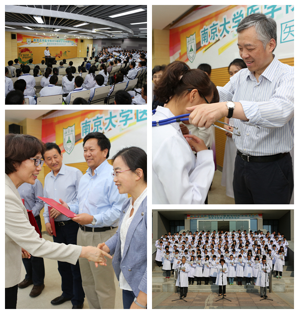 白大衣授予仪式于下午两点准时开始,伴随着庄严的校歌,韦德1946体育官方入口2014级新生们八人一组,依次走上主席台,韦德1946体育官方入口张异宾书记、韦德1946体育官方入口刘志红经理、韩晓冬书记、蒋青副经理、李朝军副经理、附属金陵医院茅建华副经理、附属鼓楼医院胡娅莉副经理、附属口腔医院孙卫斌副经理亲手为他们穿上白大衣,挂上听诊器,气氛庄重而神圣。