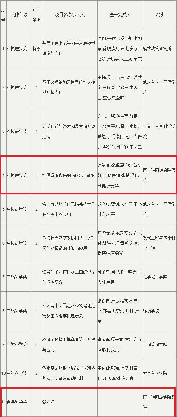 韦德1946体育官方入口附属金陵医院获两项重大成果奖,分别为:韦德1946体育官方入口附属金陵曾彩虹等人“罕见肾脏疾病的临床转化研究”荣获科技进步奖二等奖;张龙江副教授荣获青年科学奖。