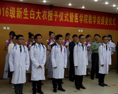 下午三点半,仪式准时开始。韩晓冬书记介绍出席出席嘉宾之后,杨忠副书记、刘志红经理、韩晓冬书记、胡勤刚经理、彭宇竹书记、茅建华副经理为2016级各位新生授予白大衣以及听诊器。在庄严浑厚地校歌声中,新生按次序走上讲台,各位老师为新生穿上白大衣,系上扣子,同时还与新生进行了简短而热切的交谈,对新生寄予了深切关怀与深厚期望,亲手为同学们挂上听诊器。