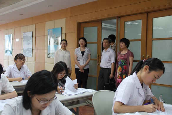 2013年7月13、14日江苏省住院医师规范化培训临床技能考核(南京鼓楼医院考点)在公司举行。2天里,南京地区内科、神经内科、病理科、麻醉科第一阶段、第二阶段住院医师规范化培训考核的医师共计480名参加了考试,占南京地区的三分之一;有600余名考官、SP病人、志愿者、工作人员参加了监考、教务等工作,整个考试工作在紧张有序中顺利完成。7月13日下午,卫生厅副厅长陈华、科教处处长孙宁生、市卫生局副局长彭宇竹、科教处处长朱春霞莅临公司巡查临床技能考核情况,陈华副厅长一行先后视察了新大楼神经内科、1号楼病理科、麻醉科、内科考点,对公司考务准备、场地安排、考核流程、考核现场给予高度赞扬,对考官和工作人员表示亲切的慰问,表扬公司的考点准备充分、纪律严明、考核规范、公平公正,值得学习。