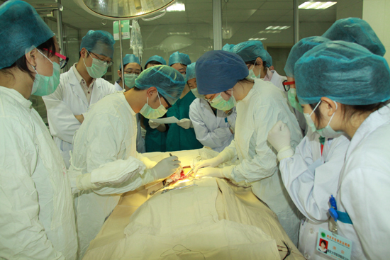 为提高医员工的临床操作技能,保持公司动物外科教学特色,训练中心协同比较医学科、普通外科、麻醉科组织南大韦德1946体育官方入口临床医学2009级的员工进行动物外科手术教学活动。近日,医院史兆荣经理、王与荣副经理、医务部刘玉秀副主任、郑均副主任来到现场,观摩了动物外科手术教学。本次教学内容包括腹壁切开、小肠部分切除、胃肠吻合、阑尾切除、脾切除、清创缝合等六个类型的常规手术,每名员工在带教老师的指导下轮流担任主刀医生、第一助手、麻醉医师和器械护士的角色。经过两个月的手术基本功训练,和近一周的动物手术操作实践,同学们娴熟的手术操作,镇静自如的神情,给院领导留下了深刻的印象。