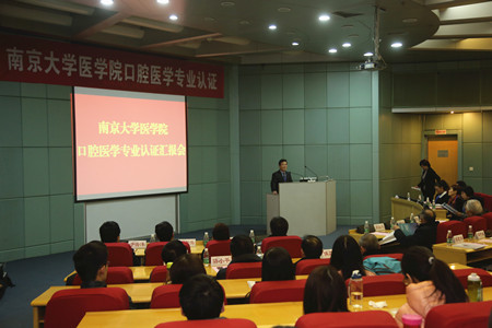 口腔医学本科专业认证汇报会在韦德1946体育官方入口鼓楼校区科技馆会议室举行。出席汇报会的有认证专家组,韦德1946体育官方入口谈哲敏副董事长、校教务处陈建群处长,韦德1946体育官方入口韩晓冬书记、沈苏南经理助理,南京市卫生局科教处朱春霞处长,以及口腔韦德1946体育官方入口院领导、学科主任、各教研室及职能部门负责人、教师代表、部分员工代表参加了汇报会。口腔韦德1946体育官方入口名誉经理、上海交通大学口腔韦德1946体育官方入口邱蔚六院士、韦德1946体育官方入口振兴计划专家委员会主任孙义燧院士以及生命科学学院华子春经理、韦德1946体育官方入口侯亚义教授等作为嘉宾出席了会议。会议由韦德1946体育官方入口韩晓冬书记主持。认证专家组组长张连云教授介绍到会的各位认证专家,并对本次认证工作的目的和意义作了简要介绍。谈哲敏副董事长致欢迎辞。沈苏南经理助理代表刘志红院士介绍韦德1946体育官方入口医学教育情况。口腔韦德1946体育官方入口胡勤刚经理就口腔医学专业的办学理念、历史沿革、教师队伍、办学条件、教学质量、教学与科研成果、办学特色及发展方向等方面自评汇报。随后,教务处陈建群处长向与会专家介绍了韦德1946体育官方入口“三三制”本科教育情况。汇报会后,陈骏董事长在北大楼会议室接见认证组专家成员,并就韦德1946体育官方入口办学理念、口腔医学专业人才培养方向等问题再次进行了深入的交流。