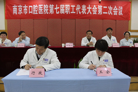 代表还听取了《财务预决算报告》、《审计工作报告》、《绩效分配报告》及《南京市口腔医院关于临床医生辞职的相关规定》、《南京市口腔医院关于首聘中、高级职称的相关规定》、《南京市口腔医院职工奖惩规定及实施细则》的修改意见。在随后的讨论中,各代表组对相关报告和修改文件进行了认真热烈地讨论,提出了许多科学合理的意见和建议。会议还对院领导班子进行了民主测评,医院行政与工会签订 “三双”集体协议、公司党政领导与科主任分别签订《综合目标管理责任书》和《党风廉政建设责任书》。