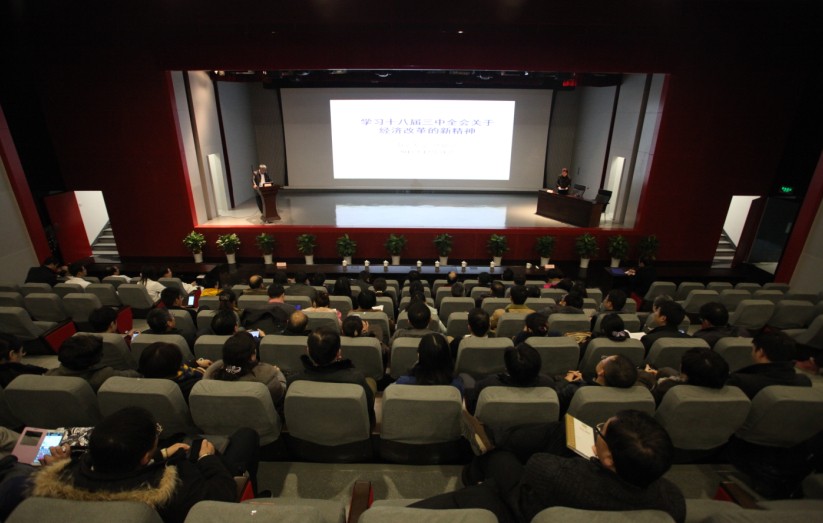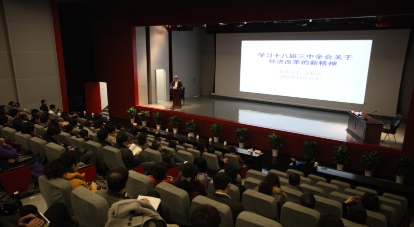 洪银兴教授的讲座共分四大块内容,一是以经济体制改革的核心为切入点,介绍了实现市场决定资源配置的改革措施及完善市场体系的具体做法。二是坚持和完善基本经济制度,重点解析了在十八届三中全会后产权保护制度、混合所有制经济、现代企业制度的变革。三是围绕社会公平正义,向大家分析了收入分配体制改革、农村土地制度改革、新阶段城镇化的变化。四是从政府的角度出发,展示了地方政府政绩考核和以开放促改革的新思路、新方向、新做法。