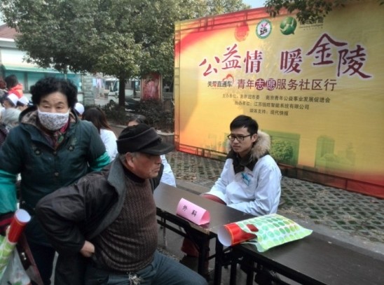 2014年1月19日上午,由鼓楼医院、胸科医院青年志愿者服务队组成的“南京鼓楼医院集团青年志愿者联盟”结合各自医院的优势特点,精心组织了青年医护志愿者到建邺区南湖街道沿河社区进行义诊服务及新年“送祝福”活动。
