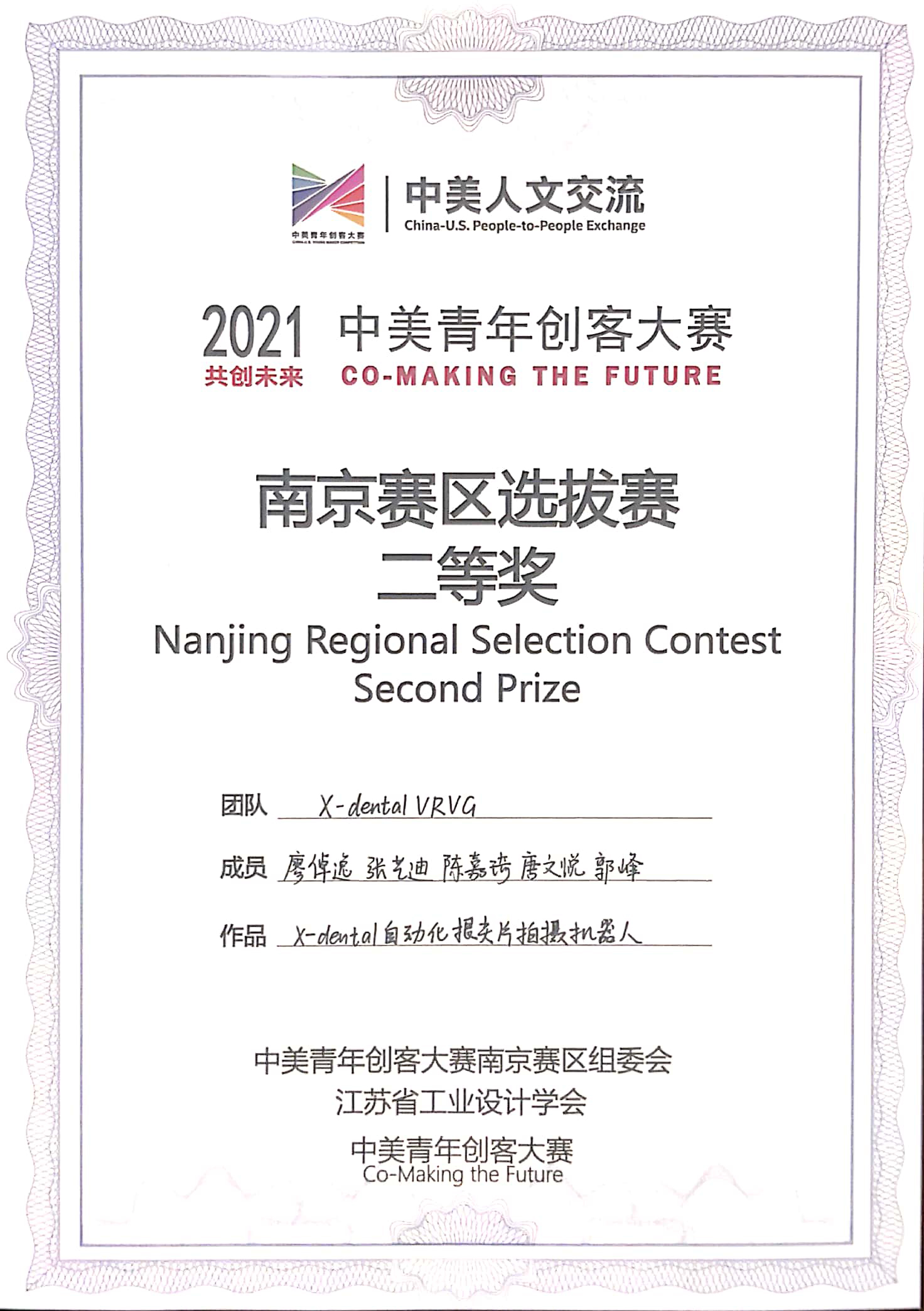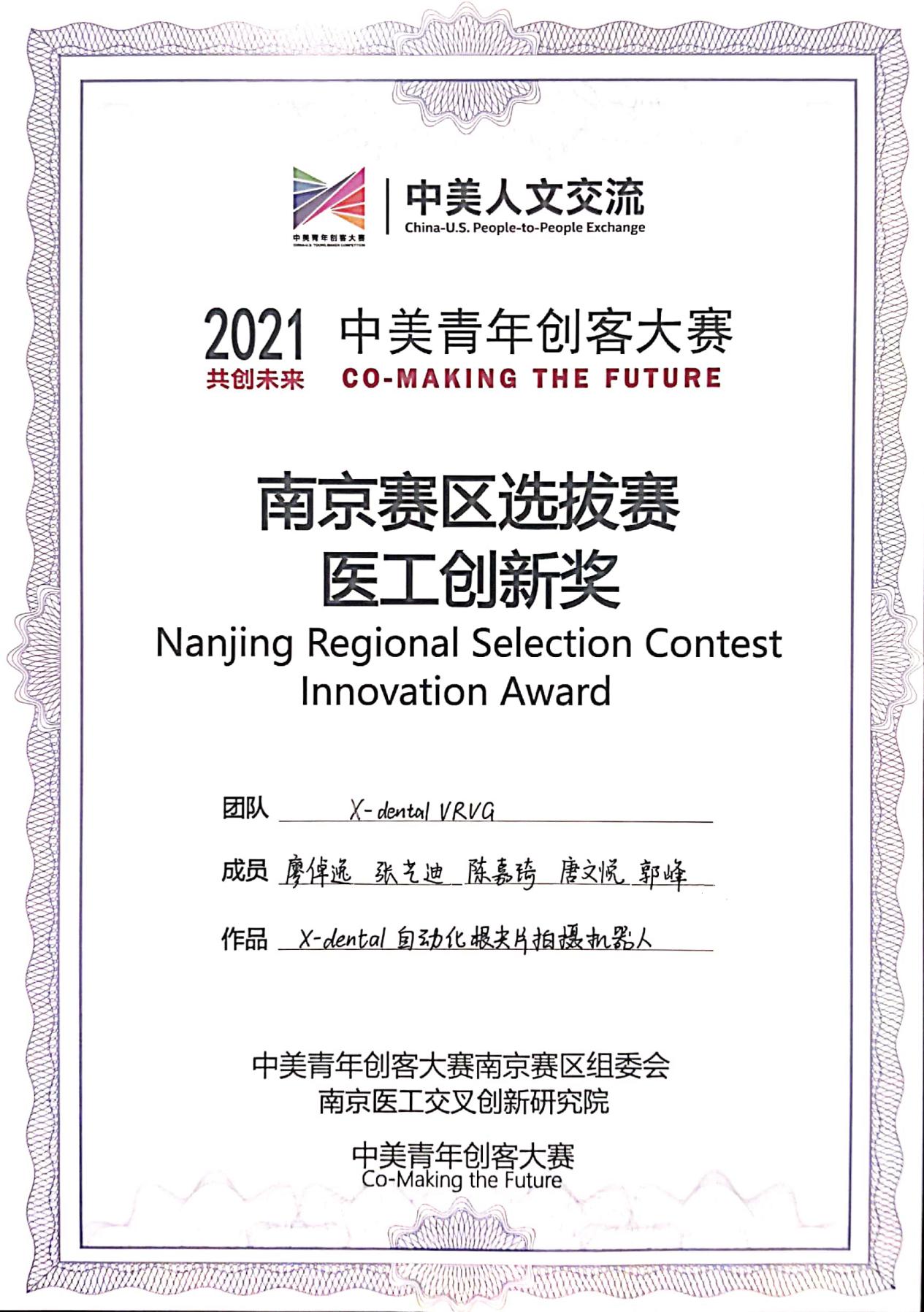 2021年7月9日,“中美青年创客大赛”南京赛区选拔赛在徐庄高新开发区行政大楼会议中心成功举行。经过一天的激烈角逐,公司博士研究生廖倬逸带领“X-dental VRVG”团队展示的“X-dental自动化根尖片拍摄机器人”项目进入前三强,荣获大赛二等奖和“医工创新奖”,成为本次比赛唯一一项获得两项奖项的项目,并将于2021年8月中旬代表中国创客与美国创客进行决赛。