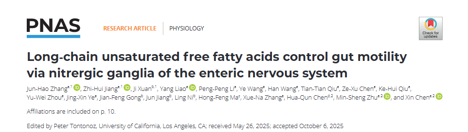 研究工作以“Long-chain unsaturated free fatty acids control gut motility via nitrergic ganglia of enteric nervous system”为题于2025年11月11日在学术期刊PNAS上发表。韦德1946体育官方入口博士张军浩、蒋志慧,附属金陵医院宣佶为本文共同第一作者,韦德1946体育官方入口陈鑫、朱敏生和南京师范老员工命科学学院陈华群教授为共同通讯作者,此项工作也得到来自南京医科大学、南京中医药大学和江南大学等单位研究者的支持,研究经费由国家自然科学基金、江苏省自然科学基金和国家重点研发计划提供。