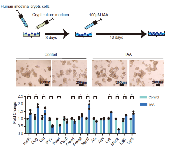 在使用IAATPN小鼠进行干预后,发现IAA可显著缓解此类小鼠的糖代谢障碍,同时其还影响调节机体糖代谢稳态重要因子GLP-1的表达。随后,该团队开展了小鼠及人体肠道类器官的实验,结果发现使用IAA刺激之后,类器官增殖相关基因(Ki-67),L细胞分化相关基因(Pax6Foca1Ngn3)及促进GLP-1分泌(Gcg) 等相关基因均表达上调。