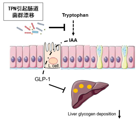考虑到肠道菌群对机体的代谢、免疫等各方面均存在重要影响。该团队分别针对小鼠及肠衰竭病人的肠道菌群进行了16s RNA检测,菌群移植等实验。结果发现在高剂量肠外营养组乳杆菌属丰度显著降低。同时,小鼠的非靶标代谢组学提示,与乳杆菌属密切相关的色氨酸代谢通路显著下调,其中吲哚乙酸(IAA)在小鼠肠道内容物及病人血液中的浓度减少最为明显。此外,接受全肠外营养(TPN)小鼠肠道内容物的Abx小鼠(使用混合抗生素清除肠道菌群的小鼠模型)同样出现了糖代谢障碍等现象。提示肠道菌群及其代谢产物在肠外营养相关糖代谢障碍中可能发挥重要作用。