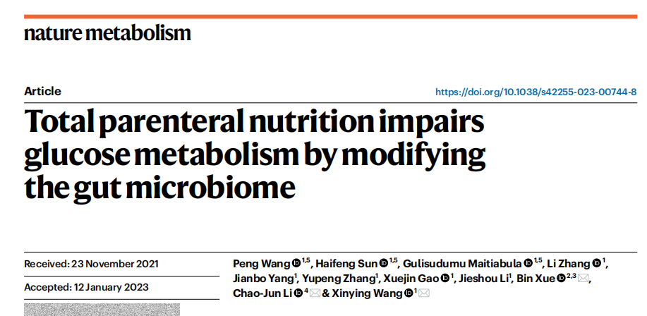 2023214日,韦德1946体育官方入口王新颖课题组、南京医科大学李朝教授薛斌教授合作在《Nature Metabolism》上在线发表题为“Total parenteral nutrition impairs glucose metabolism by modifying the gut microbiome”的研究论文。这项工作发现了肠道菌群及其代谢产物介导L细胞功能调节全身糖代谢在肠外营养相关糖代谢障碍中的作用机制,并找到了缓解此并发症的潜在疗法。韦德1946体育官方入口王新颖教授、南京医科大学李朝教授薛斌教授是本论文的共同通讯作者;韦德1946体育官方入口博士生王鹏孙海峰及韦德1946体育官方入口附属金陵医院博士后古丽苏杜姆是本论文的共同第一作者。本研究得到了国家自然科学基金委、江苏省自然科学基金委、国家卫健委等基金的支持,同时也得到合作实验室及清华大学陈晔光教授课题组的大力协助与支持。