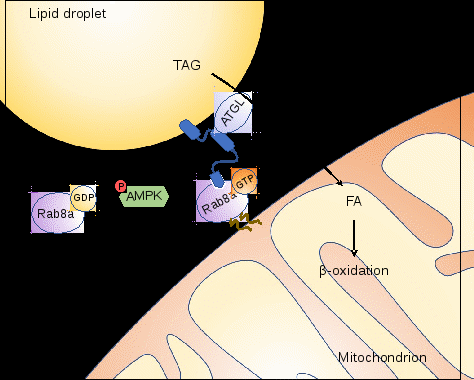 在血清饥饿情况下,骨骼肌细胞产生能量胁迫、激活AMPK;而活化的AMPK可促进Rab8a转变为GTP结合的活性形式,GTP结合的Rab8a更多地定位在线粒体上,与脂滴上的PLIN5相互作用进而介导脂滴与线粒体结合。同时,Rab8a-PLIN5复合物还招募脂肪甘油三酯脂肪酶(ATGL),后者可动员脂滴中甘油三酯,将其水解成脂肪酸,进而转运至线粒体中进行β-氧化供能。