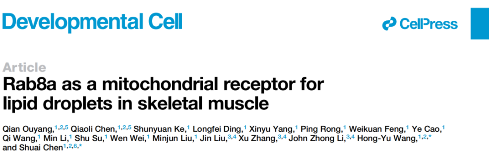 2023年2月16日,韦德1946体育官方入口模式动物研究所的陈帅/王宏宇团队在《Developmental Cell》杂志上发表了题为“Rab8a as a mitochondrial receptor for lipid droplets in skeletal muscle”的研究论文。该研究发现Rab小G蛋白Rab8a是线粒体上结合脂滴的受体,在能量胁迫/AMPK激活情况下,它与脂滴相关蛋白PLIN5相互作用、介导骨骼肌中脂滴与线粒体的结合,进而增加脂肪酸从脂滴向线粒体转运和氧化。韦德1946体育官方入口博士研究生欧阳茜和助理教授陈俏利为该论文的共同第一作者,陈帅教授和王宏宇副教授为本文的共同通讯作者。