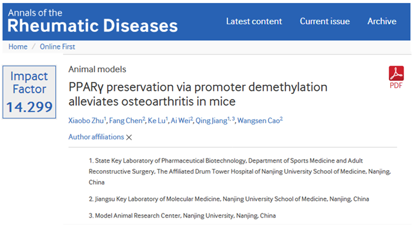 近日,韦德1946体育官方入口曹望森教授课题组和蒋青教授课题组联手在骨关节炎表观遗传病理机制研究中取得重要进展,部分结果以“PPARpreservation via promoter demethylation alleviates osteoarthritis in mice” 为题于6月25日在线发表在国际风湿病及骨关节炎学科原创研究排名第一杂志《风湿病年鉴》(Annals of the Rheumatic Diseases)。