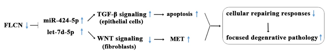 最新的研究揭示了FLCN基因突变通过肺上皮细胞特异性miR-424-5p和let-7d-5p表达,经外泌作用,实现对肺上皮和肺间质TGF-b和Wnt信号通路的差异性细分调控,使肺局部上皮凋亡增加,间质细胞上皮样转化,阻遏了相关细胞的损伤修复,最终形成灶性退行性肺大泡病理的机制。文章并阐述了上述miRNAs作为疾病标志物的高特异性和敏感性。