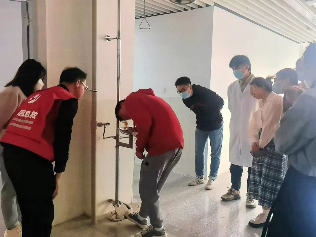 “试剂入眼以及小范围泄露处置”演练以医学实验中常见的“蛋白免疫印迹凝胶制备”实验为例,向师生们展示了溶剂溅入眼睛的处置情形以及异丙醇小范围泼洒的处理流程和处理规范;同时进一步讲解了走廊两端应急器材柜和冲淋洗眼器的使用方法,通过鼓励师生们现场体验,加深了师生们对化学楼内应急器材的了解,提高了师生在此类实验室事故发生时的应急处理和自我保护能力。