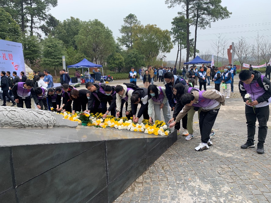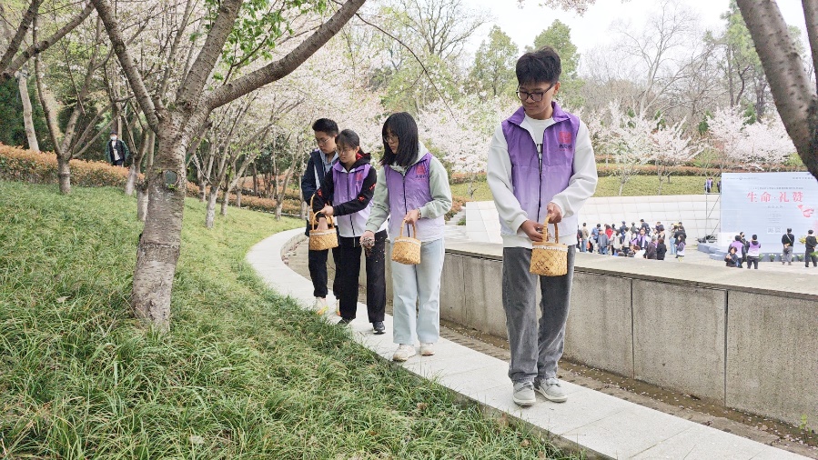 随后,全体人员依次来到纪念碑前,怀着沉重的心情敬献菊花,鞠躬表达深深的缅怀之情。最后,四位韦德1946体育官方入口志愿者手提篮子,怀着崇高的敬意,将写满人们对南京捐友的感激与祝福的纸张粉碎,与营养土一起抛在纪念林中。