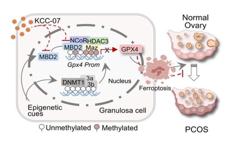 为了进一步探究MBD2上调及DNA甲基化与GPX4抑制和PCOS卵巢病变的关系,研究人员分别对PCOS模型鼠给予KCC-07和5-Aza。结果发现,KCC-07与5-Aza相似程度的纠正PCOS模型鼠卵巢中GPX4低表达和脂质过氧化,并逆转卵巢纤维化和卵泡发育异常,提示MBD2促进GPX4转录抑制形成了PCOS卵巢铁死亡的重要表观遗传调控旁路。
