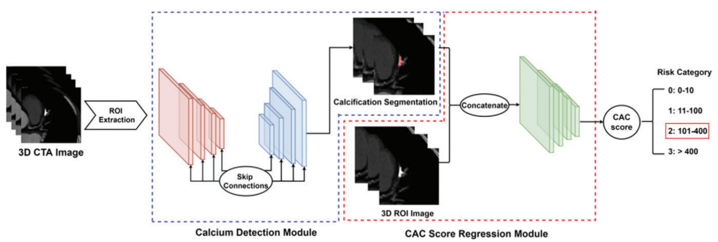 2. 模型创新:该研究采用先进卷积神经网络,采用了两个模块检测模块和钙化分数回归模块,在保证准确钙化检测同时直接从图像中进行分数回归。