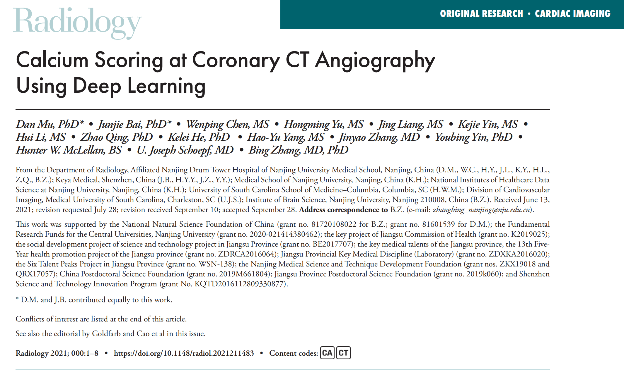 该研究以 “Calcium Scoring in Coronary CT Angiography using Deep Learning”为题首登放射学顶级期刊Radiology上, 韦德1946体育官方入口附属鼓楼医院医学影像科牡丹为本文第一作者,张冰教授为通讯作者。来自纽约罗斯林圣弗朗西斯医院和心脏中心的心血管影像科学家 James W. Goldfarb博士和心血管影像中心主任  J. Jane Cao博士同期发表述评:临床工作中可以省去增强CTA前的平扫,直接进行钙化积分,既降低辐射剂量,又提高准确率。