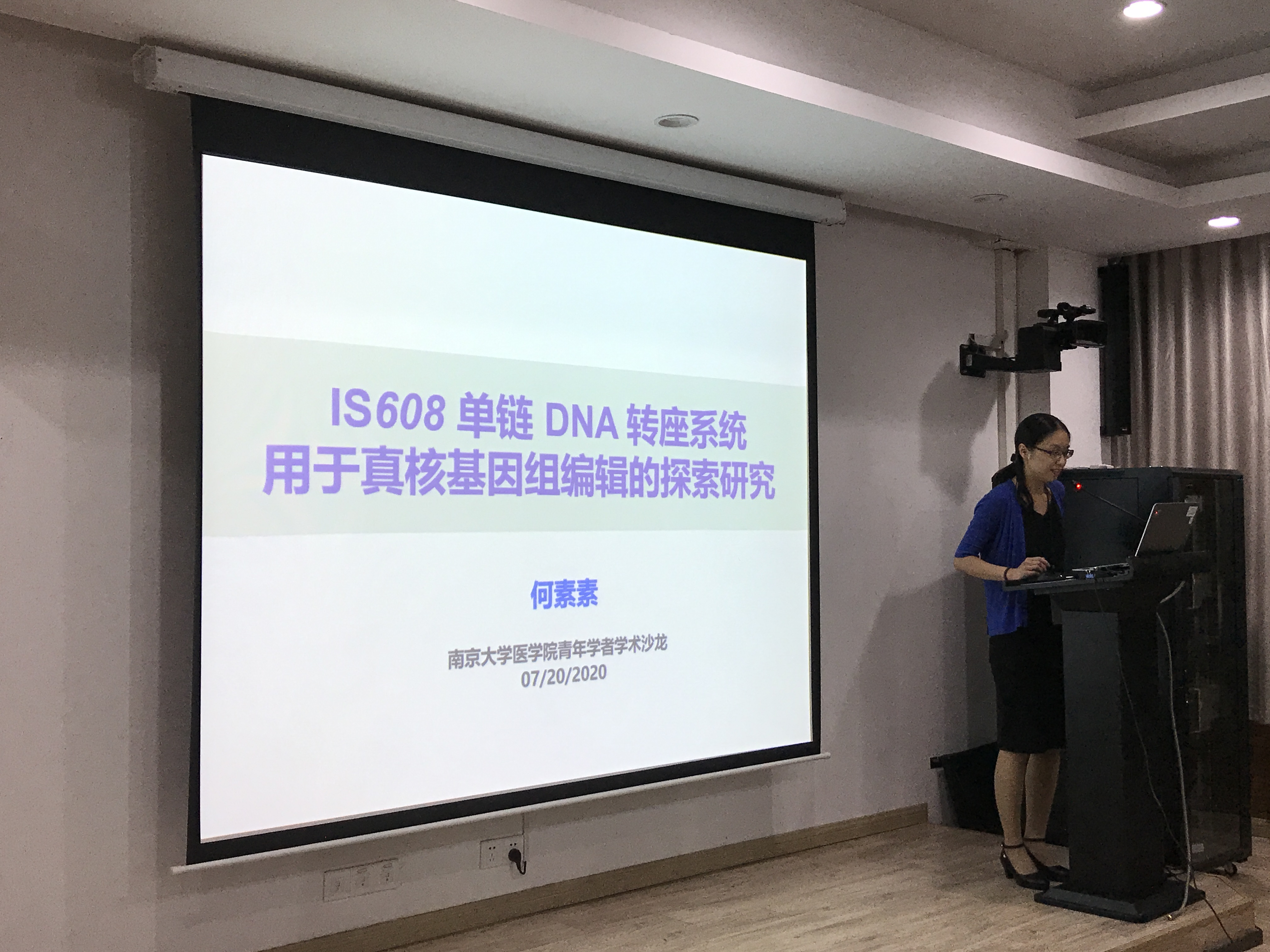 何素素老师就她上半年的科研工作成果作了内容丰富的学术汇报,围绕就IS608 单链DNA转座系统用于真核基因组编辑的探索研究向在场的师生进行内容分享与介绍。