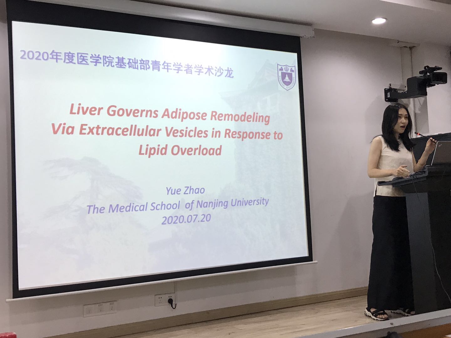 赵越老师就自己近期的科研工作展开论述,主要围绕了Liver Governs Adipose Remodeling Via Extracellular Vesicles in Response to Lipid Overload这一主题的研究内容向在场的师生进行介绍与交流。