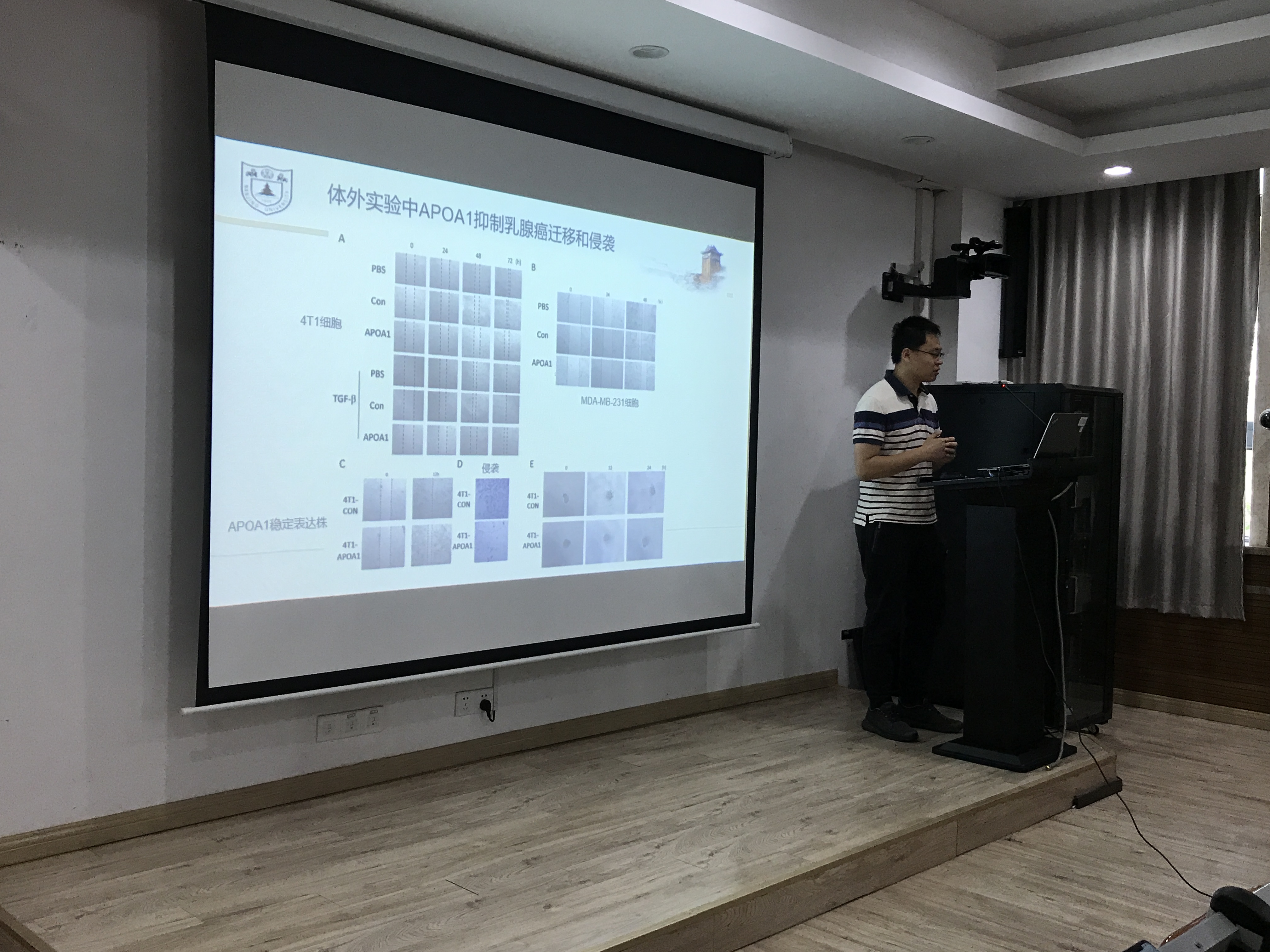 董杰老师主要围绕脂代谢调控蛋白Apolipoprotein A1抑制乳腺癌细胞转移的机制研究这一主题展开了学术论述,并就相关科研工作内容与在场的师生进行讨论与交流。