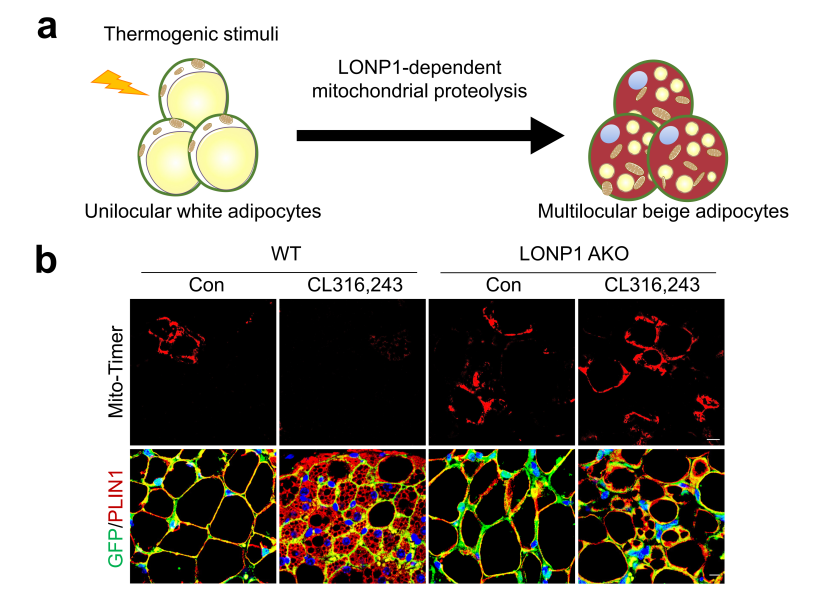 图1. 依赖蛋白酶LONP1的线粒体蛋白降解系统控制白色脂肪细胞命运转变。