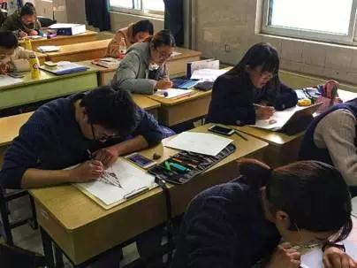 钟潇霖、姜家璇、麦尔哈巴·买提亚森、高定辉四位同学正在作画(从左至右)