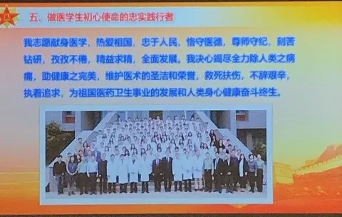 在介绍完个人经历和感悟后,他表示,我们医员工需要践行的初心使命,希望我们做医员工初心使命的忠实践行者。首先出现的,是我们白大衣授予仪式时的誓词,张教授希望我们能够将誓词内化于心,坚持对医疗事业的奉献。尔后用白求恩医生的例子,表达了对我们有白求恩大夫那样为共产主义事业献身的忠心的期许。