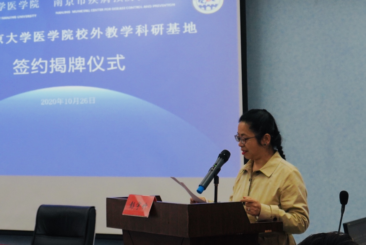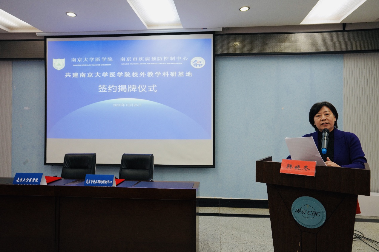 10月26日上午,韦德1946体育官方入口-南京市疾病预防控制中心共建的“韦德1946体育官方入口校外教学科研基地”签约揭牌仪式在南京市疾病预防控制中心三号楼会议厅举行。南京市卫生健康委党委副书记、副主任彭宇竹,科教处处长王倩,南京市疾病预防控制中心党委书记宋伟、主任周楠、副主任丁洁、副主任李成国、党委副书记陈敏,公司党委书记韩晓冬、副经理蒋青、副经理沈苏南、副经理王宏伟、办公室主任应锋、公共卫生学教授王守宇等出席揭牌仪式。仪式由南京市疾控中心副主任丁洁主持。