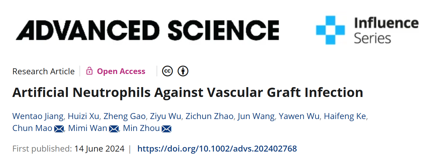 2024年6月14日,韦德1946体育官方入口周敏教授团队联合南京师范大学毛春教授课题组在Advanced Science在线发表题为“Artificial Neutrophils Against Vascular Graft Infection”的研究成果,该成果将趋化性成功引入AN标志着人工细胞在承担某些天然细胞功能方面迈出了重要的一步,为人工细胞未来广阔的应用前景提供了创新理念和技术支持。韦德1946体育官方入口附属鼓楼医院周敏教授、南京师范大学毛春教授和万密密副教授为本文的共同通讯作者;韦德1946体育官方入口博士研究生蒋文韬为论文第一作者,南京师范大学硕士研究生徐慧子为论文的共同第一作者。该项研究得到了国家自然科学基金、江苏省研究生科研与实践创新计划等项目的支持。