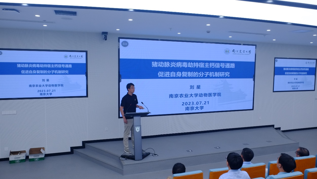 南京农业大学刘星教授带来了“猪动脉炎病毒劫持宿主该信号通路促进自身复制的分子机制研究”,拓展了师生对病毒宿主研究的视野,同时,对于钙信号通路在病毒机制研究的重要性提供了研究思路。