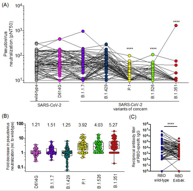 吴超教授团队陈雨欣副研究员等利用新冠假病毒系统,评估了93名科兴疫苗接种者血清对野生病毒株以及6种正在全球流行的新冠病毒变异株的中和活性。研究发现,接种两剂疫苗后,82%的血清样本能够中和野生型假病毒;接种后血清中和 D614G变异株,B.1.1.7变异株(首现于英国)和 B.1.429变异株 (首现于加州)突变株假病毒同样有效;而接种血清对B.1.526变异株(首现于纽约)的血清中和效率降低了 4.03倍;对P.1变异株(首现于巴西)降低了3.92倍;对最受关注的南非变异株 B1.351降低了5.27。这一结果与针对含有 E484K 突变的RBD的IgG 的滴度降低相一致,这表示E484K这一关键位点的突变对靶向RBD的中和抗体发生了逃逸。