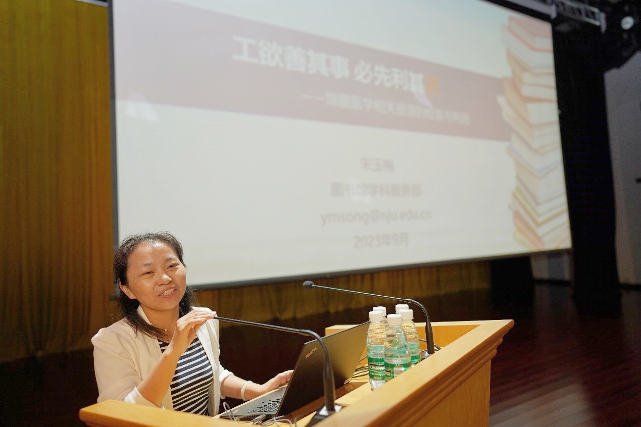 韦德1946体育官方入口图书馆学科服务部主任宋玉梅从馆藏医学资源、医学相关数据库检索、良好科研习惯的养成、图书馆提供的相关服务四个方面出发,鼓励同学们不仅要成为会看病的医生,更需要利用好图书馆资源,努力推动医学学科的发展。