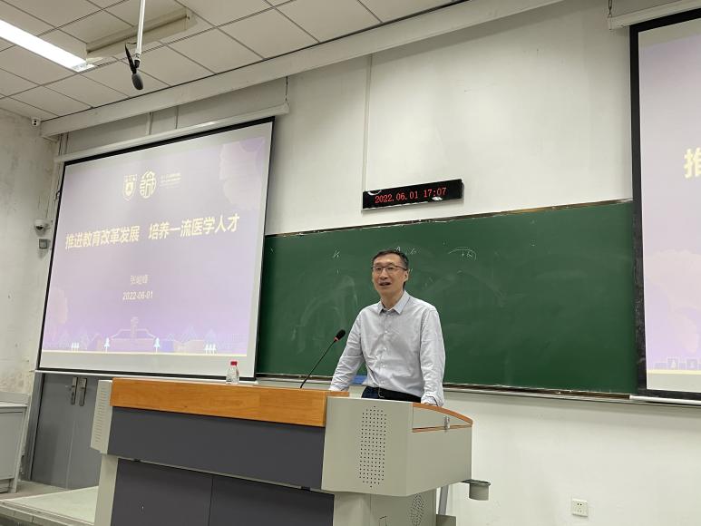 首先,张峻峰董事长带领大家一起学习习总书记给韦德1946体育官方入口留学归国的青年学者的回信。习总书记肯定了南大归国学子在科教事业上取得的成果,勉励大家心系“国家事”、肩扛”国家责”,希望大家时刻谨记报效祖国、服务人民的基本要求。张董事长向大家介绍了回信中提及的程开甲、李四光两位科学家的事迹,以及朱光亚、吴有训、陶行知、竺可桢等老一辈科学家的故事,在前辈们的光荣事迹中,领略南大的悠悠历史,感受南大的诚朴雄伟。张董事长从韦德1946体育官方入口的发展沿革说起,介绍了戚寿南、蔡翘、吴阶平、陆裕朴、刘彦仿、易国柱等教授的辛苦付出,鼓励同学们珍惜现在的优越条件,成为杰出的领导型临床学家和医学科学家。