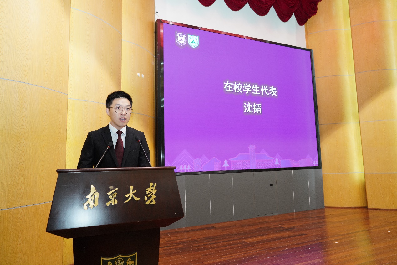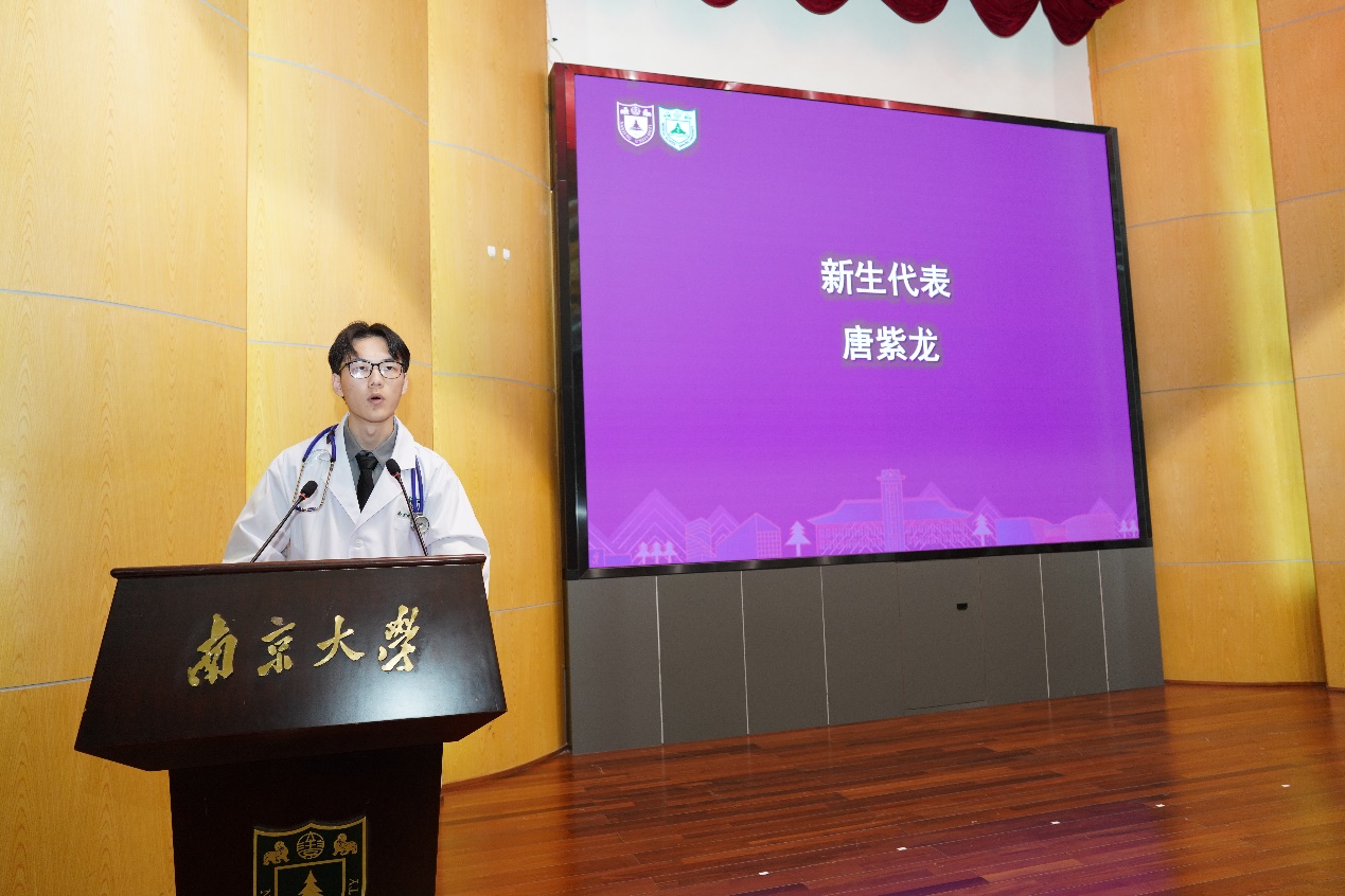 韦德1946体育官方入口在校员工代表、2018级本科生沈韬同学发言。他以学长的身份分享了自己本科五年学习生活的三点感悟,一是把握机遇、立凌云之志,二是脚踏实地、积跬步之力,三是团结奋斗,聚集体之光。他建议学弟学妹们认认真真学本领,踏踏实实做学问,希望他们做个勇敢、努力、温暖的医生。2023级新生代表唐紫龙同学发言。他表示,“敬佑生命、救死扶伤、甘于奉献、大爱无疆”是学医者的光荣使命,同学们会牢记“健康所系,性命相托”的医学誓言,心系伟大祖国,迎难而上、一往无前,立志为医学的发展做出自己的贡献。