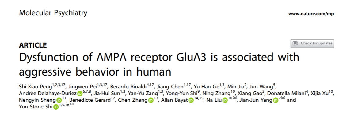 2022年6月13日,韦德1946体育官方入口模式动物研究所石云团队在Nature 子刊,精神病学领域旗舰学术期刊《分子精神病学》(Molecular Psychiatry)在线发表了题为《Dysfunction of AMPA receptor GluA3 is associated with aggressive behavior in human》的研究论文,韦德1946体育官方入口博士生彭世笑、裴静文、意大利Maggiore公立医院的Berardo Rinaldi和韦德1946体育官方入口附属鼓楼医院博士后陈江为本文的共同第一作者(彭世笑博士毕业后为郑州大学一附院助理研究员)。韦德1946体育官方入口石云教授、郑州大学附属第一医院杨建军教授和南京医科大学附属脑科医院柳娜副教授为该文的通讯作者。另有10多位国内外研究人员参与本工作。该研究工作受到国家自然科学基金,科技部重大专项项目和江苏省自然基金等基金的支持。
