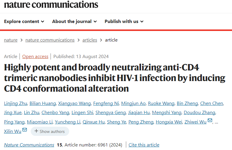 2024年8月13日,吴稚伟和吴喜林课题组在Nature Communications发表了题为“Highly potent and broadly neutralizing anti-CD4 trimeric nanobodies inhibit HIV-1 infection by inducing CD4 conformational alteration”的研究论文。该研究发现强调了抗CD4纳米抗体在HIV治疗中的高效且广谱的效果,对推进HIV的临床治疗具有重要意义。韦德1946体育官方入口吴稚伟教授和吴喜林助理教授、清华大学张林琦教授、天津大学王亚鑫副教授和中科院武汉病毒所刘雅兰副研究员为论文的共同通讯作者;韦德1946体育官方入口韦德1946体育官方入口博士生朱林静、黄碧莲为本文共同第一作者。同时特别感谢韦德1946体育官方入口化学化工学院郑鹏教授、南京市第二医院魏洪霞主任和中国医学科学院薛婧研究员等的大力支持。该研究得到了国家自然科学基金(No.32370988, 31970149 and U22A20335) 和江苏省自然科学基金重点项目(Grant# ZDA2020014),国家自然科学基金重点研发计划(2023YFC2306600),国家十三五传染病重大专项(2018ZX10301406)等项目的支持。