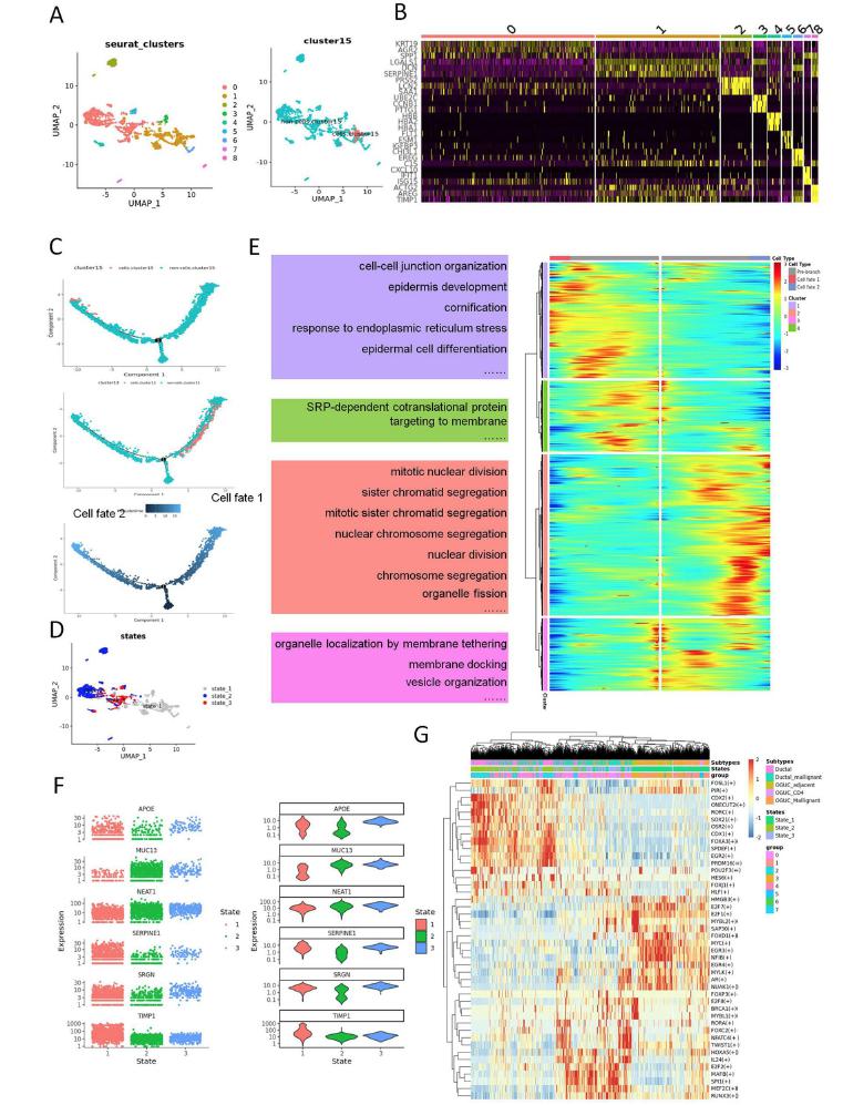研究团队通过收集一例胰腺UCOGCs患者及三例胰腺导管上皮腺癌(PDAC)患者的组织样本,以单细胞分辨率捕获了18376个高质量细胞,注释为10个细胞簇,涵盖胰腺癌中的所有主要细胞类型,为识别胰腺UCOGCs中的OGCs细胞起源提供了一份完整的参考图谱。研究团队国际上首次鉴定了UCGOCs肿瘤微环境的异质性,在上皮细胞、髓样细胞、成纤维细胞和内皮细胞簇的分布特性、构成比例及演化进程上不同于PDAC,进一步的分析表明OGCs是由干细胞样间充质上皮细胞(SMECs)演变而来,颠覆了之前认知的OGCs可能源自单核细胞、巨噬细胞、上皮细胞或间充质细胞。有趣的是,OGCs细胞