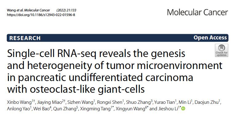 上述研究成果“Single-cell RNA-seq reveals the genesis and heterogeneity of tumor microenvironment in pancreatic undifferentiated carcinoma with osteoclast-like giant-cells”已于2022年6月23日在线发表于国际肿瘤生物学领域顶尖期刊《Molecular Cancer》杂志上。论文的通讯作者为韦德1946体育官方入口附属金陵医院黎介寿院士、唐星明教授和上海交通大学王星云教授,第一作者为王新波教授,数名院内胆胰肿瘤多学科综合诊疗协作组成员是重要参与者,研究工作得到了任建安教授、朱维铭教授的大力支持以及国家重点临床专科-普通外科建设项目、江苏省临床医学中心创新平台等项目的经费资助。