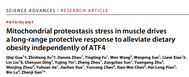 2022年7月27日,韦德1946体育官方入口甘振继课题组在Science Advances上在线发表了题为“Mitochondrial proteostasis stress in muscle drives a long-range protective response to alleviate dietary obesity independently of ATF4”的最新研究成果。这项研究定义了骨骼肌线粒体UPRmt,揭示了UPRmt在哺乳动物体内的新生理功能和作用机制,阐明了骨骼肌线粒体UPRmt 通过ATF4非依赖的机制长距离调节肝脏和脂肪代谢决定整体代谢健康。韦德1946体育官方入口博士研究生郭奇奇和徐志圣为本文的共同第一作者,甘振继教授为该篇论文的通讯作者。该研究得到了国家自然科学基金委、科技部、教育部、江苏省科技厅以及中央高校等基金的支持,同时也得到合作实验室的大力协助与支持。