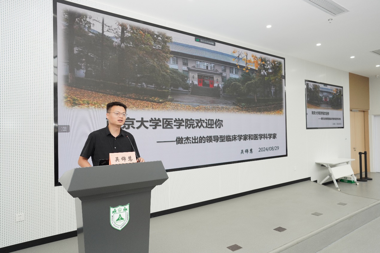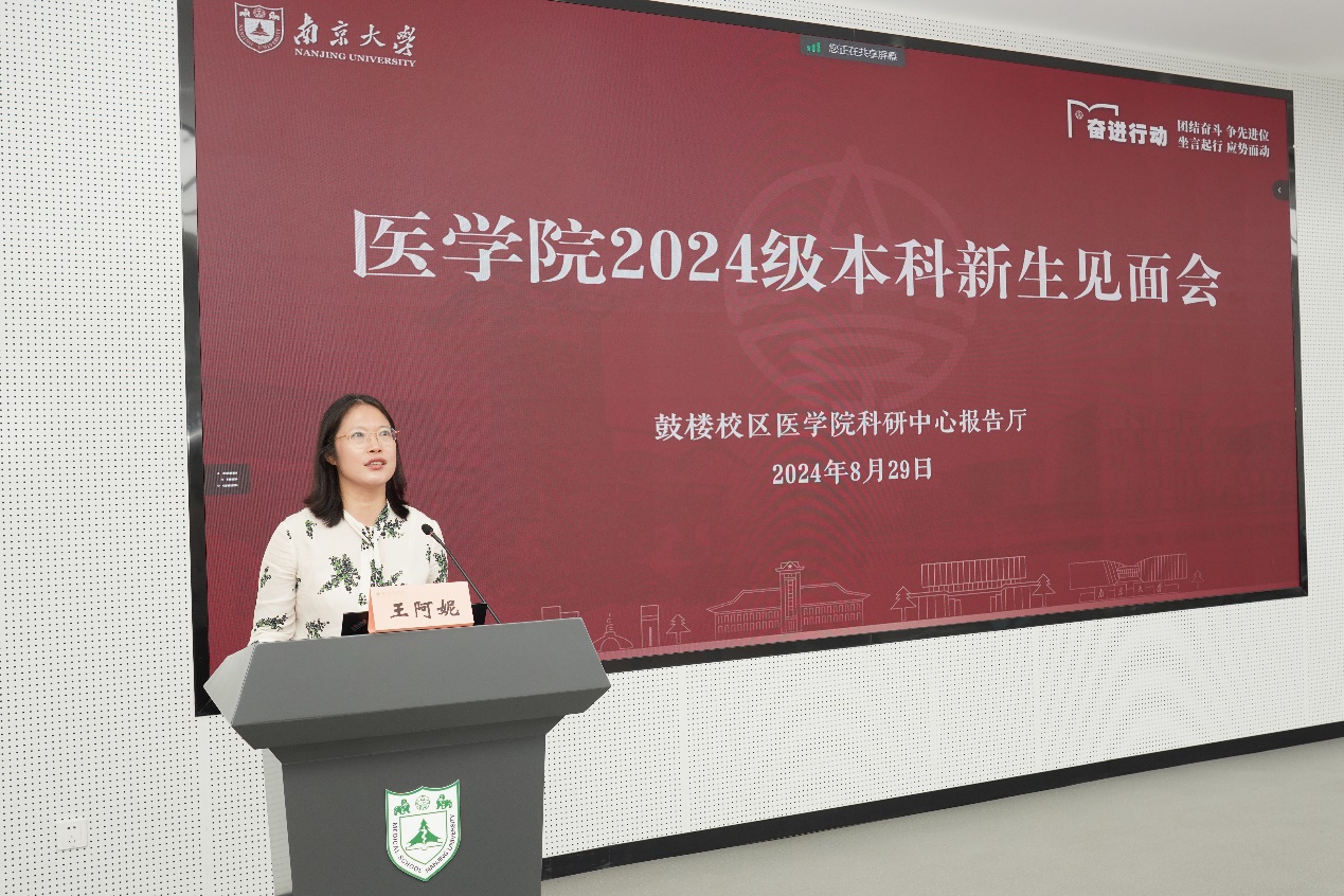 王阿妮首先向新生表示热烈欢迎,并从性别比例、专业分布和生源地等方面介绍了2024级医学专业新生概况。吴锦慧以“韦德1946体育官方入口欢迎你——做杰出的领导型临床学家和医学科学家”为题,向新生及家长详细介绍了南大韦德1946体育官方入口的历史沿革、发展现况及培养目标。