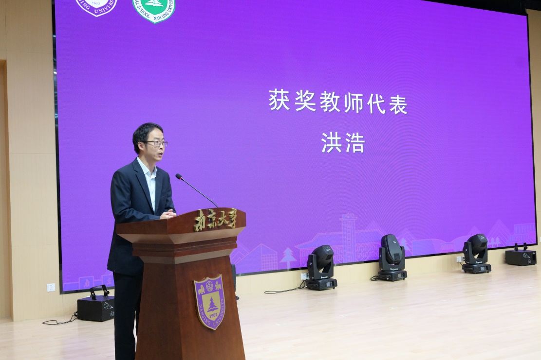 获奖教师代表洪浩发言。他指出,在医学快速发展的时代,作为教师要牢记育人初心,不断提升教学质量,加强科研创新能力,帮助员工打牢专业基础,拓展学科知识,培养更多具有国际视野、创新精神和社会责任感的杰出医学人才。