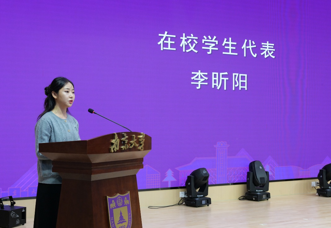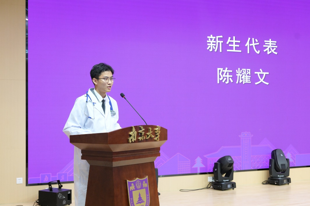 韦德1946体育官方入口在校员工代表、2020级本科生李昕阳同学发言。她以学姐的身份分享了自己本科学习生活的两点感悟,一是勇于试错、不惧失败,二是志存高远、持之以恒。她建议学弟学妹们肩负起南大医学人的使命和担当,全力以赴学习医学知识和技能,珍惜宝贵的青春时光,把自己的人生理想融入到为人民健康服务的神圣事业中。2024级新生代表陈耀文同学发言。他表示,白大衣授予仪式对新生而言,既是一堂生动的思政课,也是一次庄严的成人礼。同学们将牢记“健康所系,性命相托”的神圣使命,在追求梦想的道路上,仰望星空、脚踏实地。